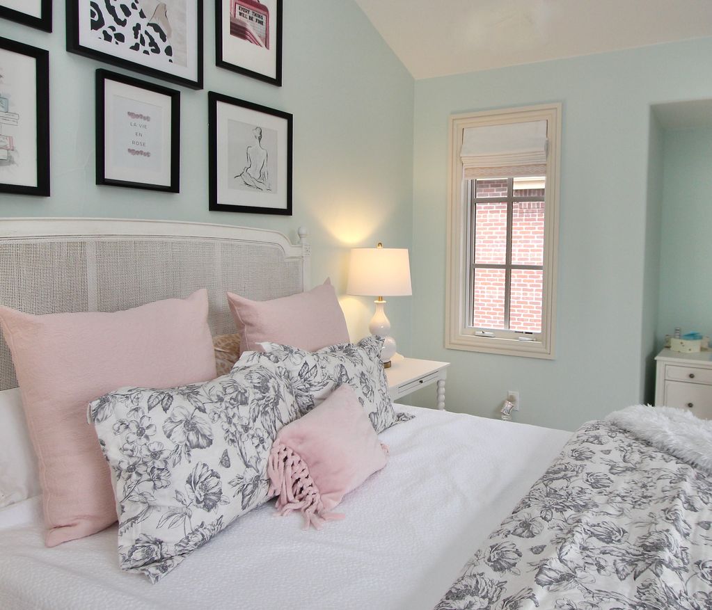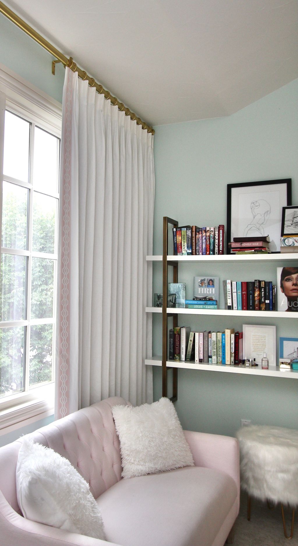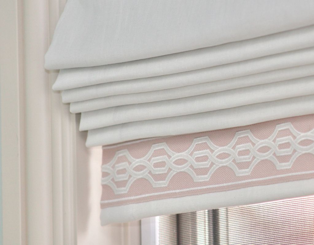 Schumacher white linen blackout roman shade with Samuel and Sons beautiful pink border tape.